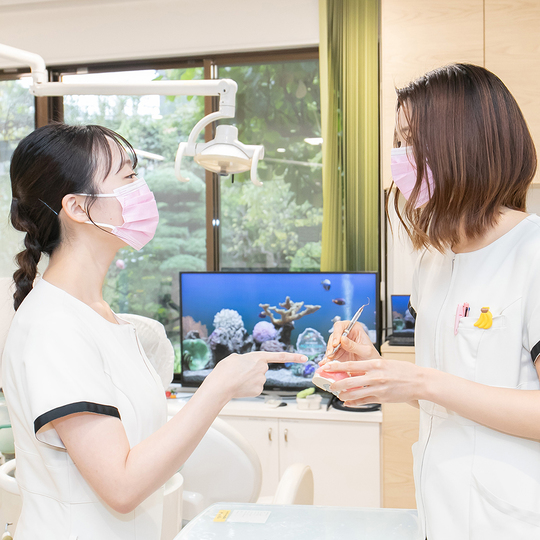 歯科医師・歯科衛生士・歯科助手兼受付の各職種に向け、治療内容や手順を詳しく解説したマニュアルを用意しています。歯科医師臨床研修指導歯科医である院長や、先輩スタッフによるマンツーマン指導も実施しています。