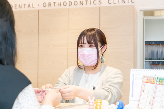 お任せするのは、一人の患者さまに対して予約から受付、そして診療まで一貫して関わっていく業務です。患者さまを最初にお迎えする「医院の顔」として電話対応や予約管理などを行う受付業務を7割、治療の現場で行う診療補助などの歯科助手業務を3割の比率で担当いただきます。