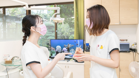 入職から2か月間は、基本的な知識や技術の習得に重点を置いています。教育担当の先輩歯科衛生士がマンツーマンで丁寧に指導。マニュアルも用意しているため、安心して学べます。